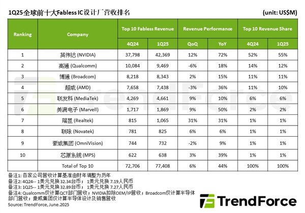 根据Trendforce的最新报告,在2025年第一季度,世界上十大IC设计的收入在本季度上涨了近6%,达到了774亿美元,这是一项很高的记录。其中,NVIDIA在AI数据中心领域的领先地位,第一季度收入超过423亿美元,每季度增加12%,每年增长72%,占总收入的55%,持续排名第一。第二是高通的排名,第一季度为94.7亿美元。由于淡季影响以及苹果自我开发的芯片的潜在影响,手机业务的下降,高通的总收入在本季度下降了6%。在AI网络互连解决方案领域的 - 深度布局中,Broadcom在第一季度排名第三,半导体收入达到834亿美元,每年增长15%。 AMD的第四级,第一季度的收入为7.44美元n,季度下降了3%,但与2024年相比,逐年增长了36%。联发科学对焦点9400+的需求排名第五,焦点8000系列中国中国手机客户的客户和手机大学单元的平均价格上涨。由于PC客户的库存增加,Wi-Fi 7渗透率增加以及对汽车以太网的需求增加,Realtek的收入增加了31%,超过10.6亿美元。 Howe Group(Vail)在本季度获得了智能手机的第一个季度淡季,收入下降了2%至7.3亿美元,但该公司在图像传感器和汽车电子产品方面取得了重大发展。 [本文的结尾]如果您需要重新打印,请确保指示起源:Kuai技术编辑:黑色和白色