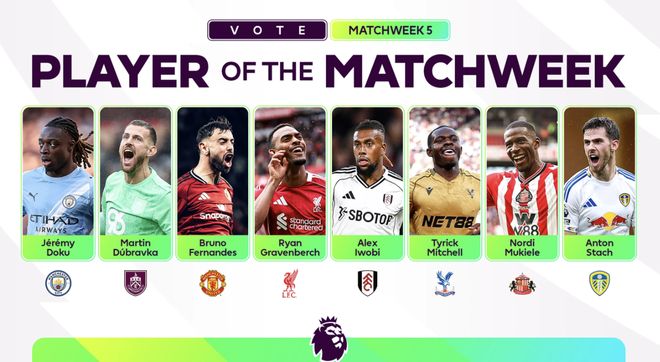 Leisu Sports在9月22日报道说,英超联赛正式宣布了最佳球员第五轮的候选人。其中,Duoku,BFE和Herafenberg在名单上。 Docu(阿森纳1-1曼城)曼彻斯特边锋Docu活跃在比赛中,该游戏已经击中了阿森纳的防守多次,继续以速度和创造力造成威胁。杜布巴夫卡(伯恩利1-1诺丁汉森林)伯恩利守门员杜布巴夫卡(Dubbuffka)制作了7个钥匙,可以节省整个比赛,这是对球队得分的最大贡献。布鲁诺·费尔南德斯(Bruno Fernandez)(曼联2-1切尔西)在第200届英超联赛比赛中为曼联取得了重大进球,并在修复进攻方面发挥了重要作用。荷兰人的中场球员哈拉芬堡(利物浦2-1)中场进球,并帮助默西塞德德比(Merseyside Derby)在各个方向控制中场并表现良好。 Iwobi(富勒姆3-1布伦特福德)伊沃比(Iwobi成功。米切尔(West Ham United 1-2水晶宫)离开了米切尔(Mitchell)的胜利进球,帮助水晶宫在整个赛季中继续继续输掉17场比赛。 Mujale(桑德兰1-1阿斯顿维拉)与球队更少的球员,Mujale Town的防守线完成了主要的许可,以确保球队保持积分。斯塔赫(狼队1-3利兹联)以任意球打进了斯塔赫的出色进球,同时表现出对中场的热情和控制,以帮助利兹赢得本赛季的第二次成功。