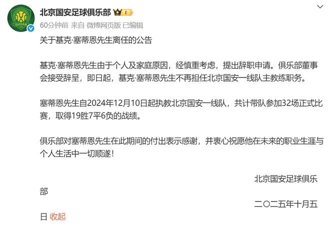 10月5日晚上,北京公共正式发布了柯克·塞蒂安(Kirk Setien)教练的宣布。原始文本如下:柯克·塞蒂安(Kirk Setien)先生申请辞职,以供个人和家庭因素辞职。俱乐部董事董事会接待辞职,从现在开始,柯克·塞蒂安(Kirk Setien)先生将不再担任北京吉安第一支球队的总教练。 Setien先生自2024年12月10日以来就接受了北京郭安(Beijing Guoan)的第一支培训,导致该队参加了32场官方比赛,获得了19场胜利,7场平局和6次失利的记录。俱乐部在这段时间对Setien先生的努力表示感谢,并衷心希望他在未来的职业生涯和个人生活中一切顺利! Setien在确认他从北京贡亚(Beijing Guaan)中撤离后说,爱情告别了北京市,并以一百恩市的身份告别了北京市:现在,出于某些个人原因,他决定结束与北京吉安足球俱乐部的工作合同,该俱乐部应该在此期末到期。我想表达我的g在这段时间里帮助我的所有朋友的含量。感谢所有团队工作人员,并感谢您最近几个月的合作。感谢所有球员,感谢您的奉献精神和努力,并传达了我对法庭比赛的热情和追求。我要感谢北京公共的主席,因为您给了我一个去中国教练的机会,尤其是在中国最重要的足球俱乐部的教练。我还希望我在这里的所有同事将来成功。在远处,我将继续付款并支持该小组,作为北京恒星迷,以庆祝每个人的一切成功。再见,你致敬。据称,北京电视台的记者的原因是Setien被解雇的原因。记者说,俱乐部管理层确实给了Setien很好的耐心。俱乐部在家里1-3中消失后,俱乐部指出,调整了暴露问题。在泰山0-6消失后,他们从董事长,总经理担任助理教练,他们都谈过o setien多次,但下一个仍然很难,连续三个损失。导致这种解雇的真正融合是对麦克阿瑟及其在法庭上展示的一切的距离。在比赛之前,俱乐部显然向Setien派遣了北京公共的传统,应该尽力而为。在了解了首发名单之后,俱乐部管理层感到震惊和生气。到目前为止,俱乐部管理尚未看到任何重要的步骤来解决问题。 Setien的助理教练团队不仅俱乐部的高级管理人员也通过了许多意见,而且主教练尚未采用它,因此教练团队的失败变得越来越重。如果Setien继续执教,俱乐部管理人员认为,球队将很难在足总杯决赛前返回赛道,并且球员将失去对赢得比赛的信心,这将导致更衣室逐渐失去控制权。管理层认为联盟与A之间的每场比赛足总杯决赛前的Sian冠军联赛非常重要,球队的信心不会丢失,因此应该决定确定主教练的决定。团队的首要任务是重建信任并恢复心态。未来的联赛将有四轮,AFC Cham Group phasepions联赛的四个树枝和最后一个足总杯。我们必须表现出我们的水平和精神,我们必须在最后一场足总杯中为冠军而努力。资料来源:综合北京恒河俱乐部,微博,新华社等。